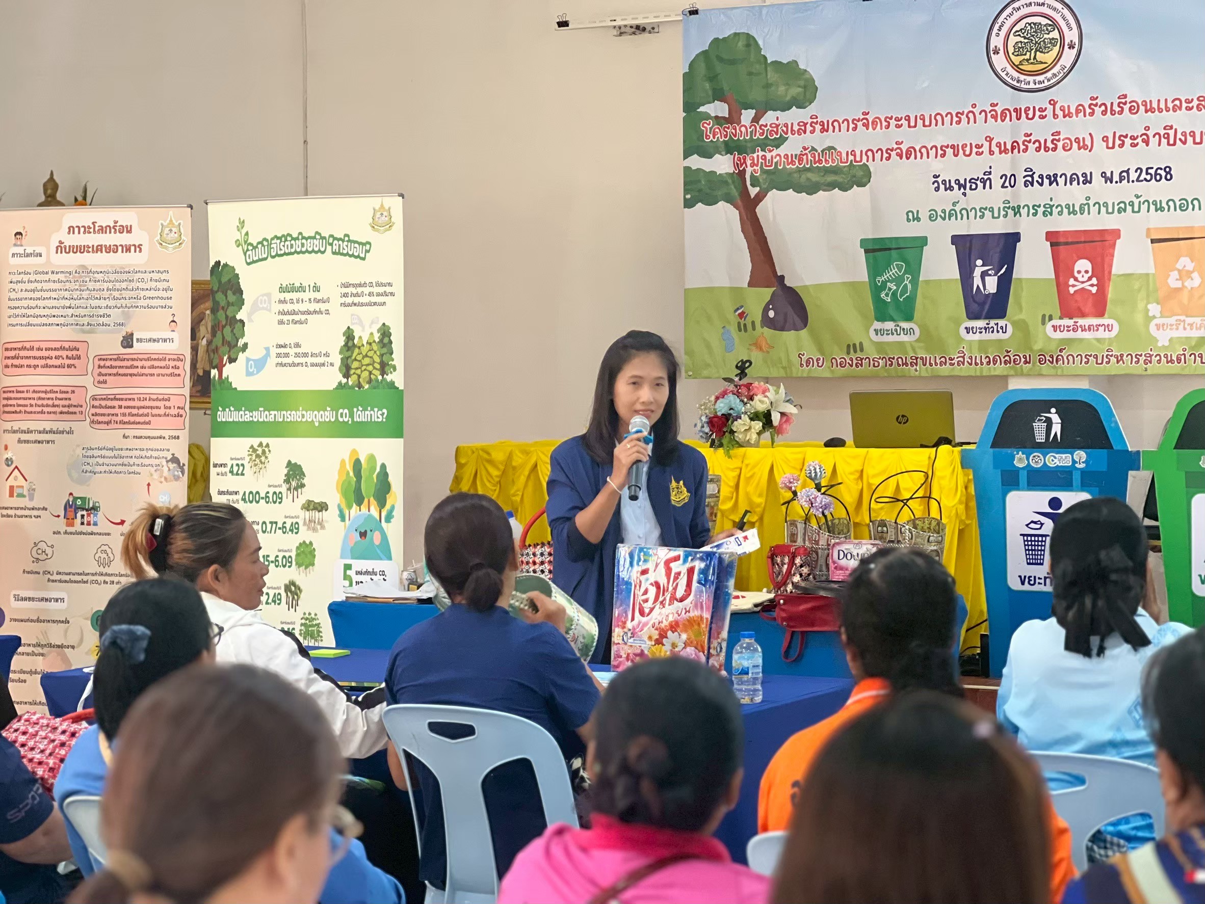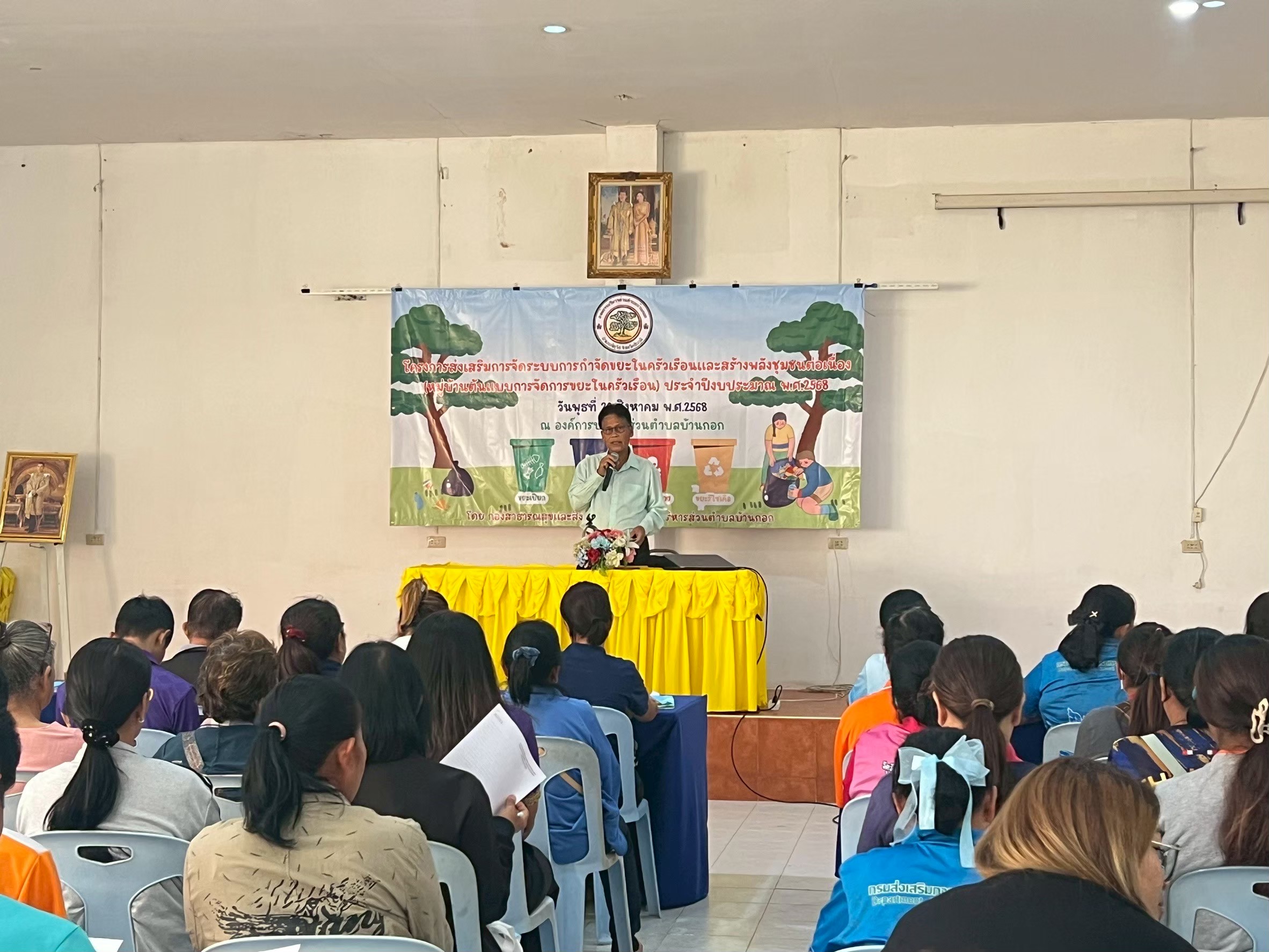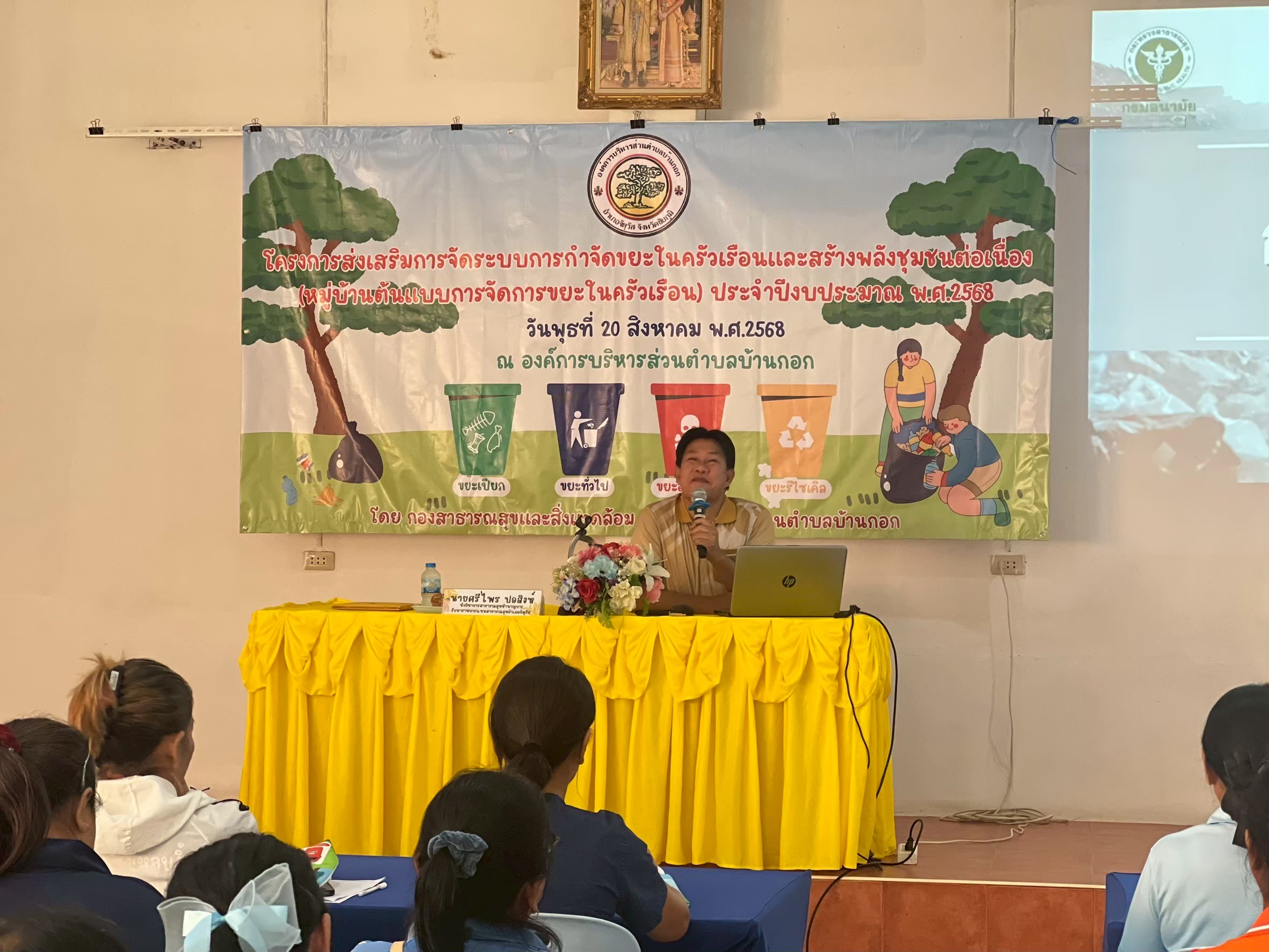 องค์การบริหารส่วนตำบลบ้านกอก ได้ดำเนินการจัดโครงการ “ส่งเสริมการจัดระบบการกำจัดขยะในครัวเรือนและสร้างพลังชุมชนต่อเนื่อง (หมู่บ้านต้นแบบการจัดการขยะในครัวเรือน)” ในวันที่ 20 สิงหาคม 2568 เพื่อส่งเสริมให้ประชาชนในพื้นที่มีความรู้ ความเข้าใจ และตระหนักถึงความสำคัญของการคัดแยกขยะตั้งแต่ต้นทาง รวมถึงการนำขยะกลับมาใช้ประโยชน์อย่างเหมาะสม