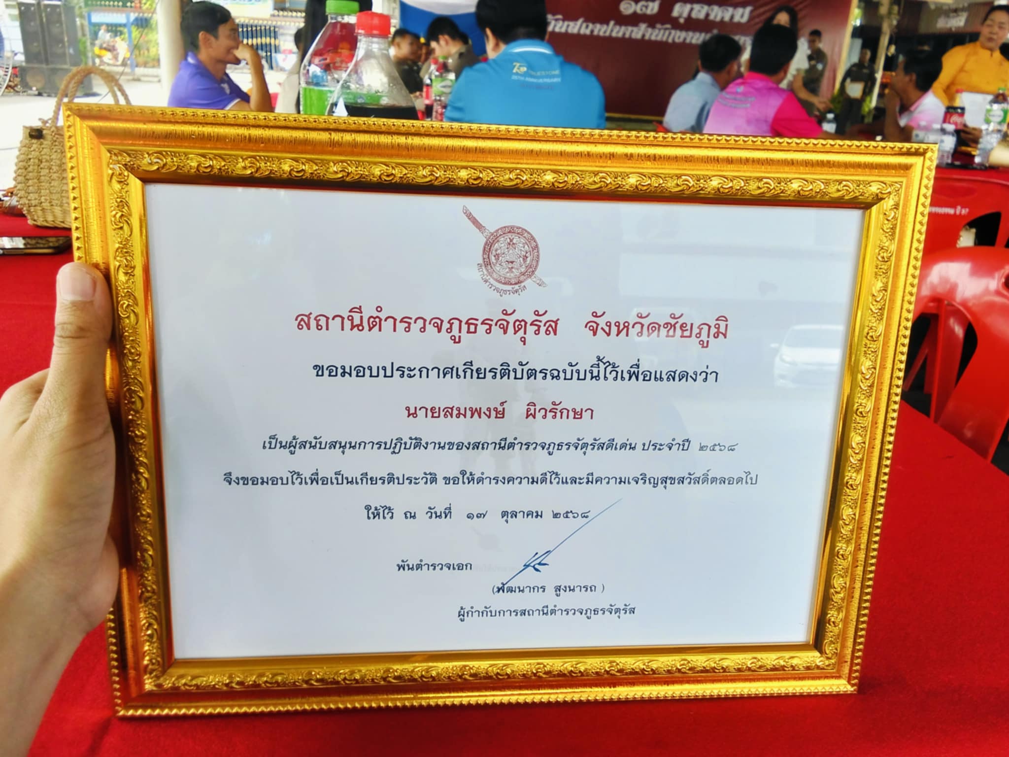 พิธีรับมอบประกาศเกียรติบัตรเป็นผู้สนับสนุนการปฎิบัติงานของสถานีตำรวจภูธรจัตุรัสดีเด่น ประจำปี 2568 วันที่ 17 ตุลาคม 2568
